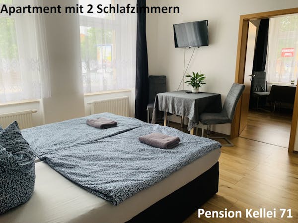 Eine Wohnung im Erdgeschoss mit 2 Schlafzimmern, eine Küche und ein Badezimmer. Das erste Schlafzimmer ist ein Durchgangszimmer zum zweiten Schlafzimmer.
