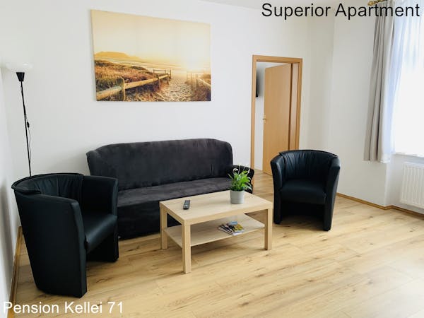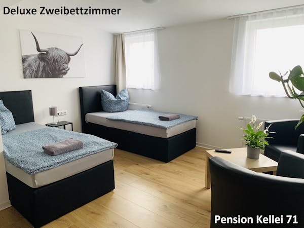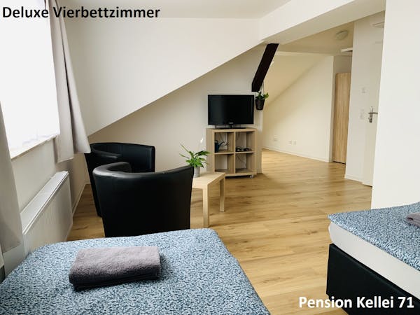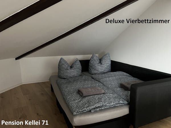 Deluxe Familienzimmer mit zwei Einzelbetten und zwei Schlafsofas (160cm breit) für bis zu 6 Personen. Es ist im dritten Obergeschoss mit eigenem Badezimmer und zugang zur Gemeinschaftsküche.