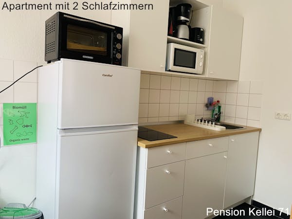 Eine Wohnung im Erdgeschoss (Eingang ebenerdig) mit 2 Schlafzimmern, eine Küche und ein Badezimmer.