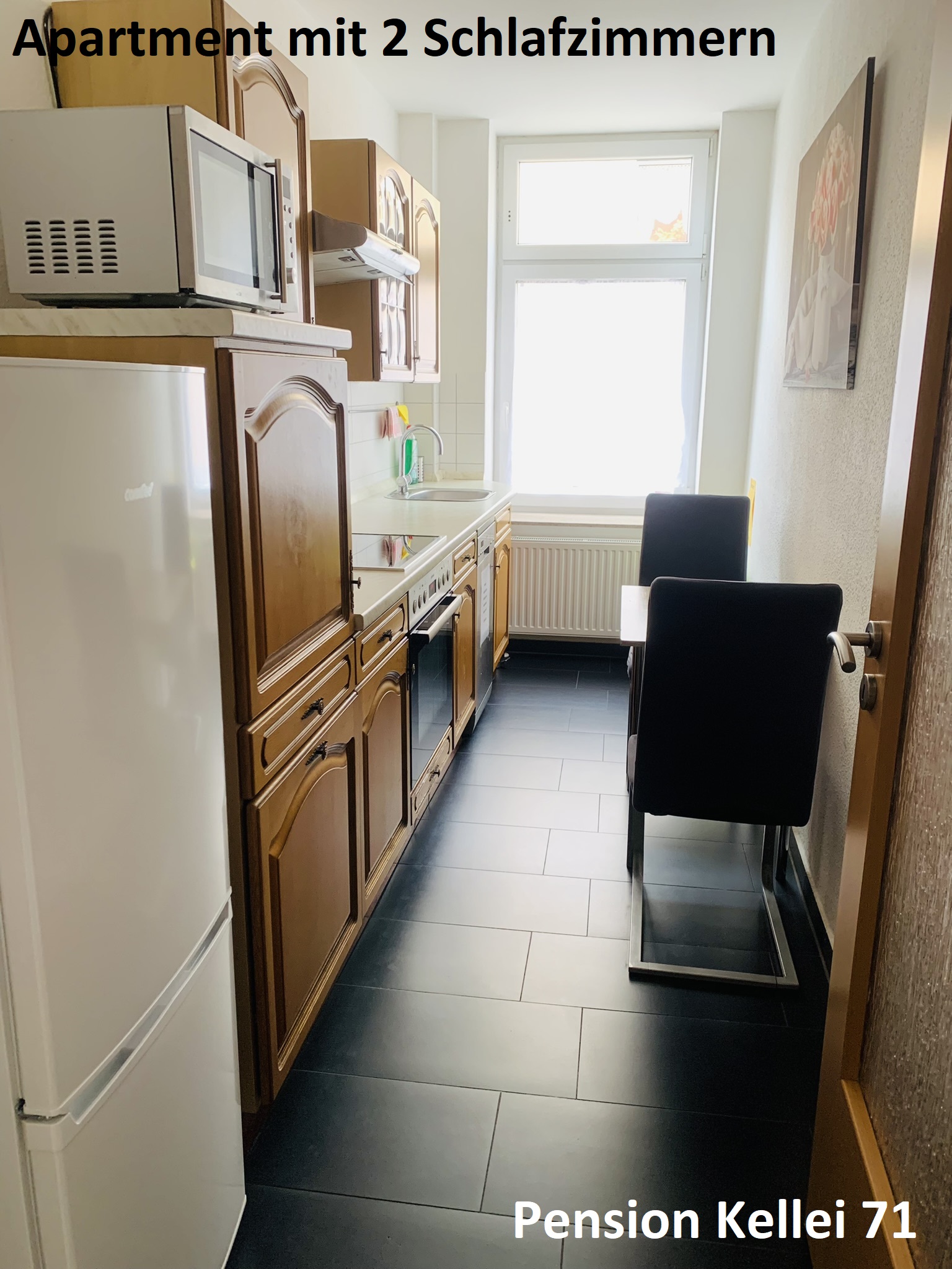 A first floor apartment (entrance at ground level) with 2 bedrooms, a kitchen and a bathroom.